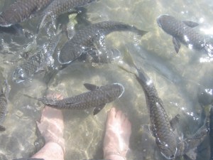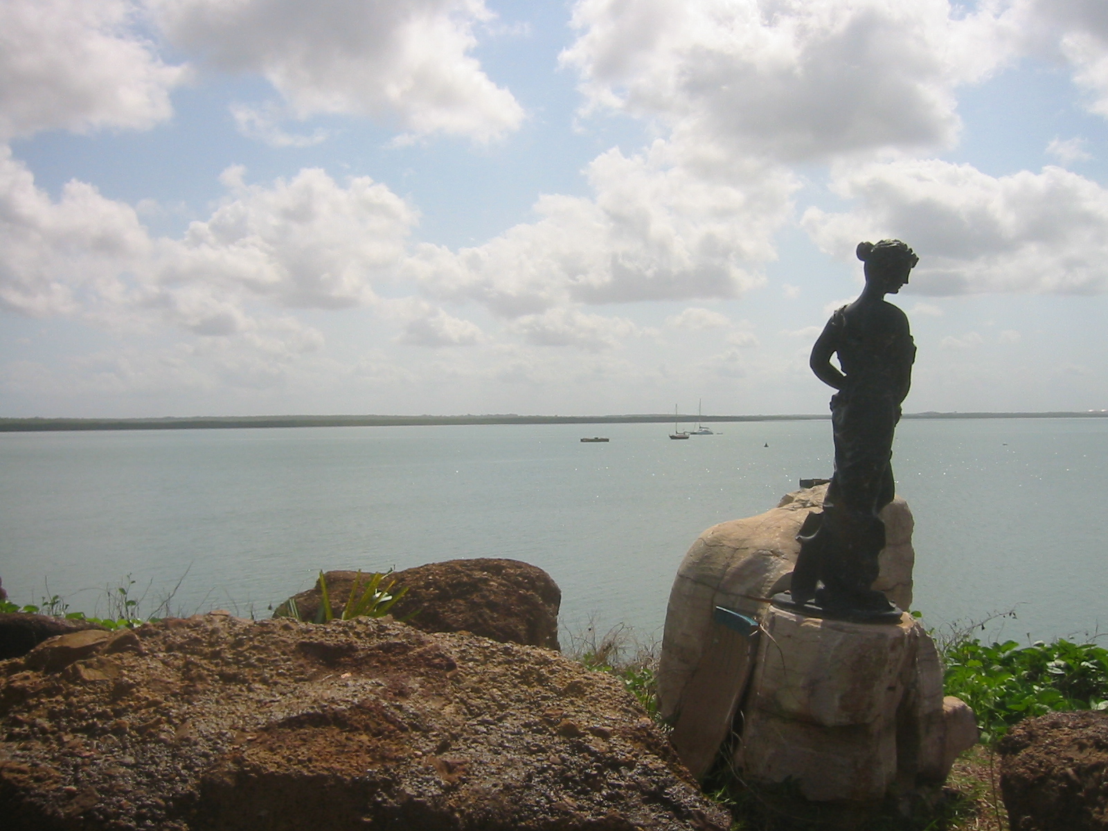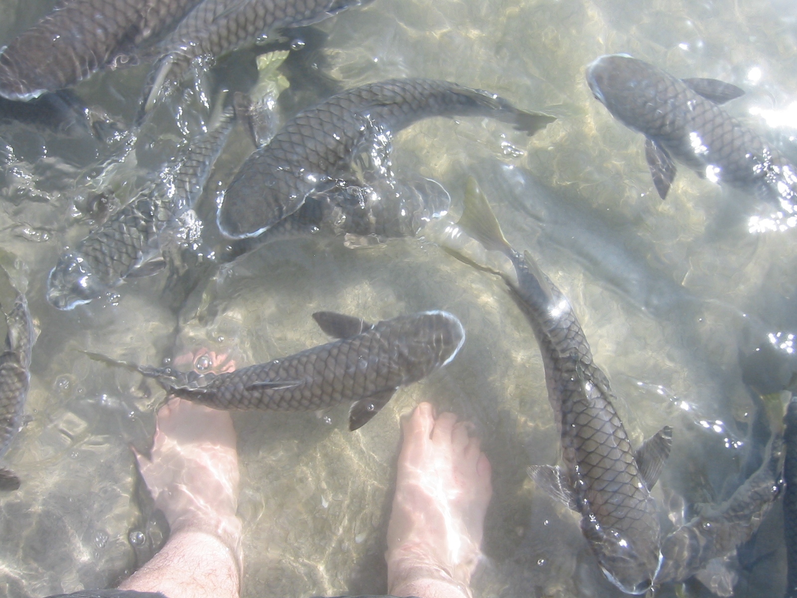 Also noch Zeit um Darwin zu erkunden. Man sieht Darwin ist geruestet fuer die Hitze, zu mindest im Bierbereich. Auch ein australische Version der Meeresjungfrau wird geboten. Tja und Bild 3 zeigt das Fischfuettern am Director’s Gully.(sind bitte meine Fusserln…)
