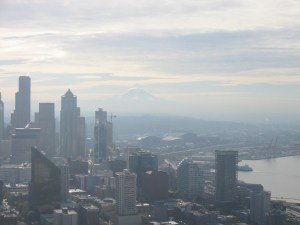 Von der Space Needle jedenfalls hat man einen guten Ausblick über die Stadt. Schüchtern im Hintergrund: der kleine über 4.000m hohe Mount Rainier.
