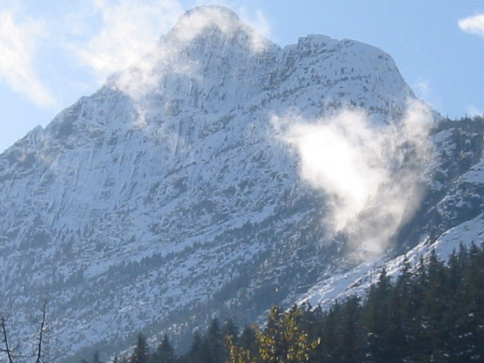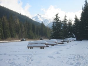 und dann am Rogers Pass Neuschnee, dahinter ein Gletscher, leider bisserl in den Wolken. Neben dem Highway geht auch die Eisenbahnstrecke, die man so um 1890 schon über den Pass führte, um zum Pazfik zu gelangen..