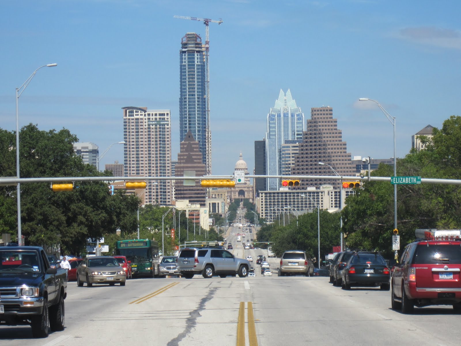 Die Einfahrt ins Stadtzentrum von Austin. Hauptstadt und sehr viel anders als Houston. Die Texaner geben Gas am Highway, wird mit lockeren 70 M/h über die Lande gezogen und relativ wenig kontrolliert. Glaubt man gar nicht vom republikanischen Kernland.