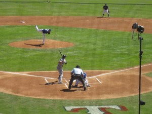 der Pitcher der Rangers in Action, die legten auch los und waren bis zum 8. von 9 Innings 6:2 vorne..