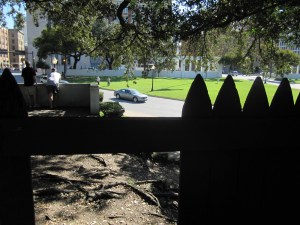 Hier fielen ja die Schüsse auf JFK. Die Frage bleibt offen, wars die Sicht des Schützen von oben(original ein Stock weiter unten) oder doch vom Zaun daneben….