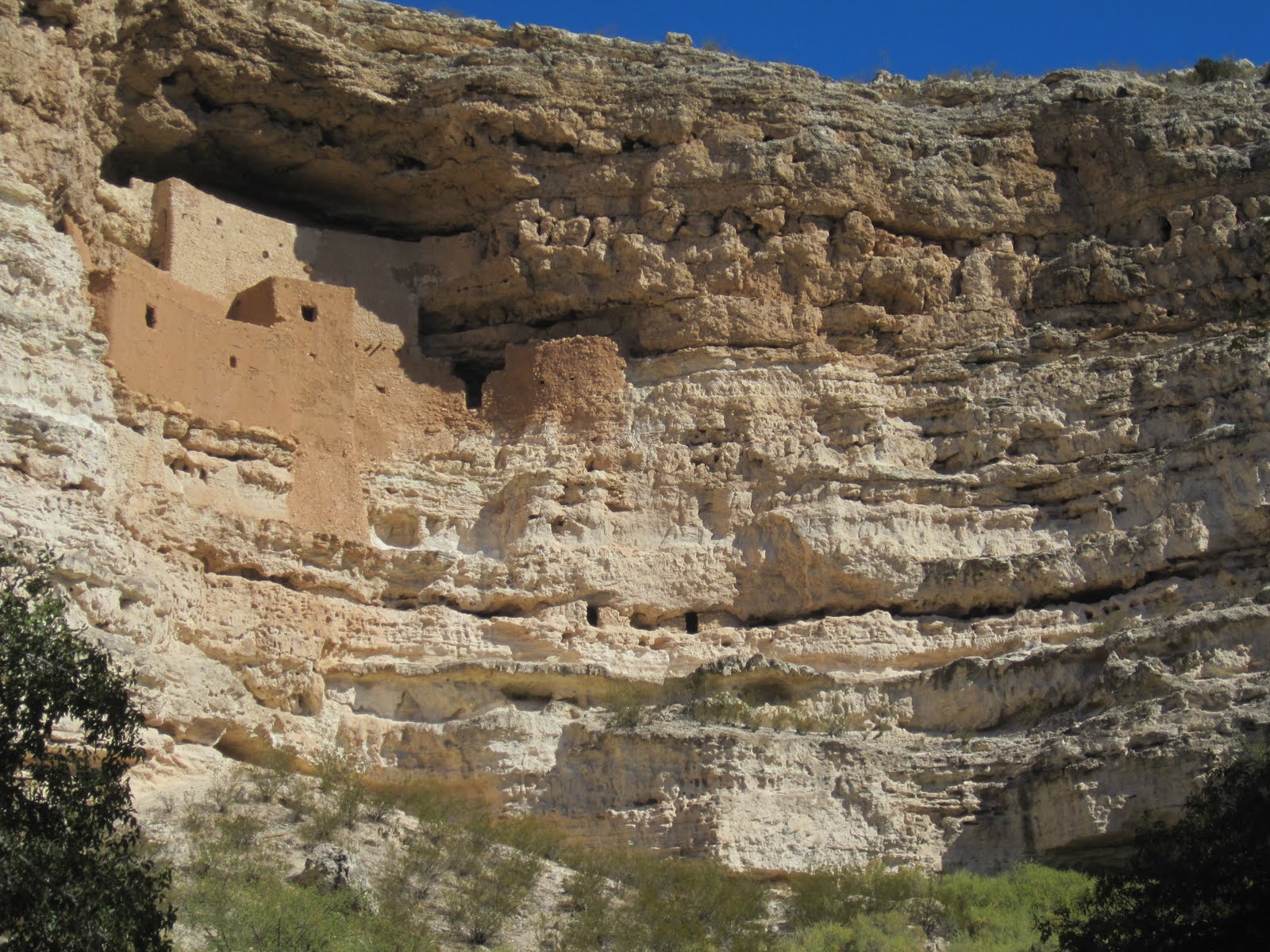 Montezumas Castle, benannt von unseren Hispano-Austros, weil die sich nicht vorstellen konnten, das wer anderer als Azteken sowas bauen könnte. Das Pueblo war schon gute hundert Jahre vorher verlassen worden, Gruende unbekannt, und warum die Sinauga ohne bekannte Feindeinwirkung in den Kalkstein gezogen sind, weiss man auch nicht. Dauerte aber wieder gute 300 Jahre bis man sich wieder diesen Ruinen erinnerte und vorbei schaute…