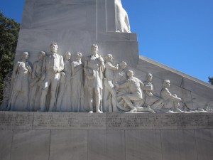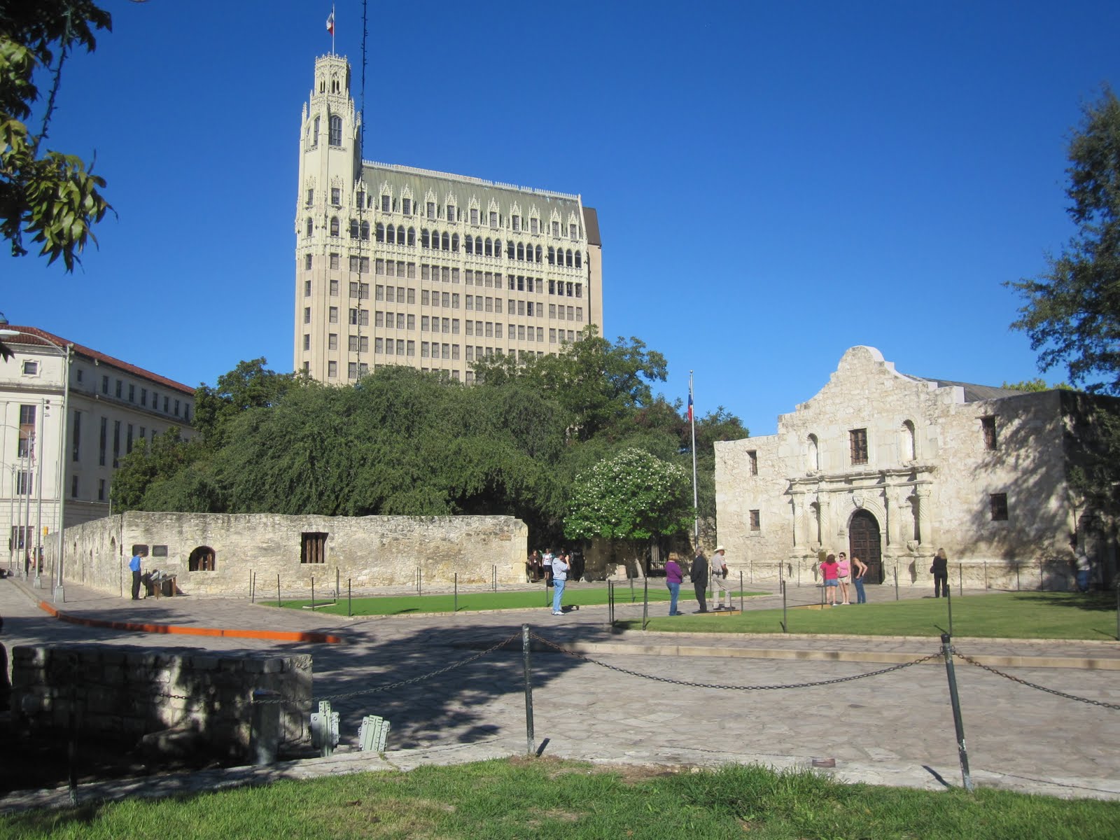 Quasi am original Schlachtfeld, das was übrig blieg, war ja nur die Mission. Das Rundherum steht schon lang nicht mehr. Die Originalhelden. Crockett, Col. Travis und der Herr Bowie. Also der Erfinder des Messers, nicht der Sänger.