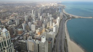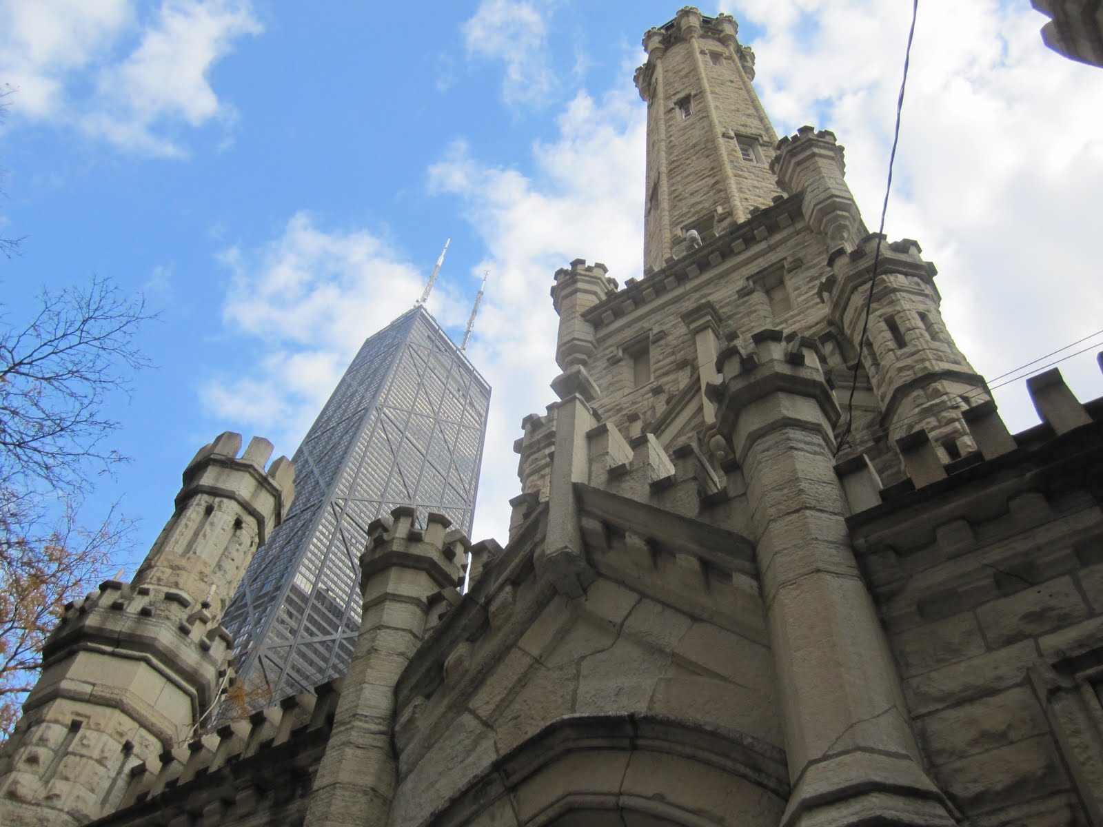 Eines der wenigen Gebäude das den großen Brand von Chicago überlebt hat, der Wasserturm. Dahinter das Hancock Center, 2. höchste Gebäude von Chicago, wo das Bild davor entstanden ist….