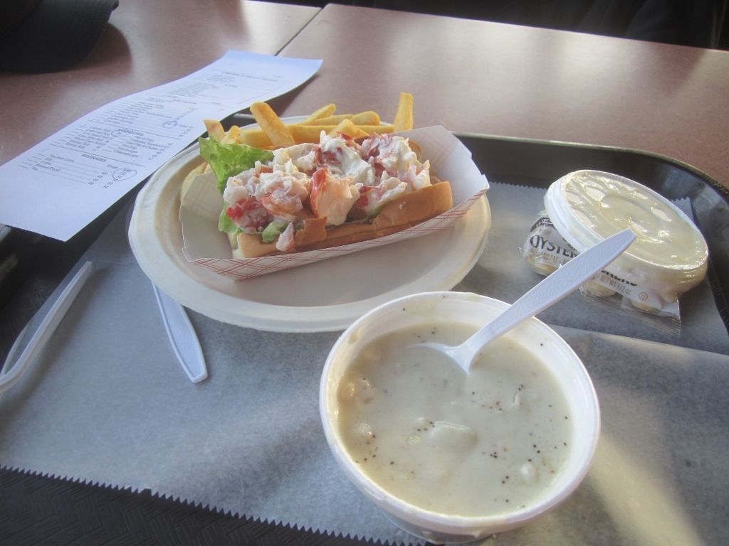 Traditionelle New England Kost wird geboten: Clam Chowder zum Aufwärmen und ein Lobster Roll Sandwich.