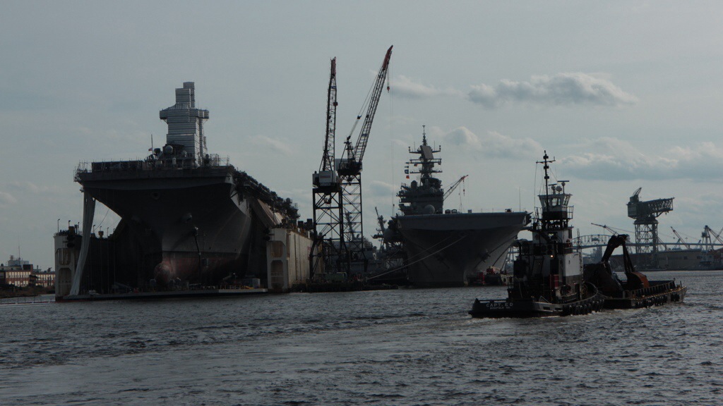 Nicht nur Museumsschiffe liegen vor Anker, gleich gegenüber wird an neuen Hubschrauberträgern gebaut…