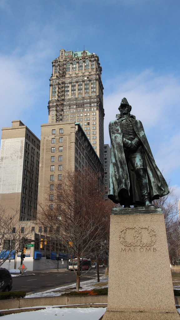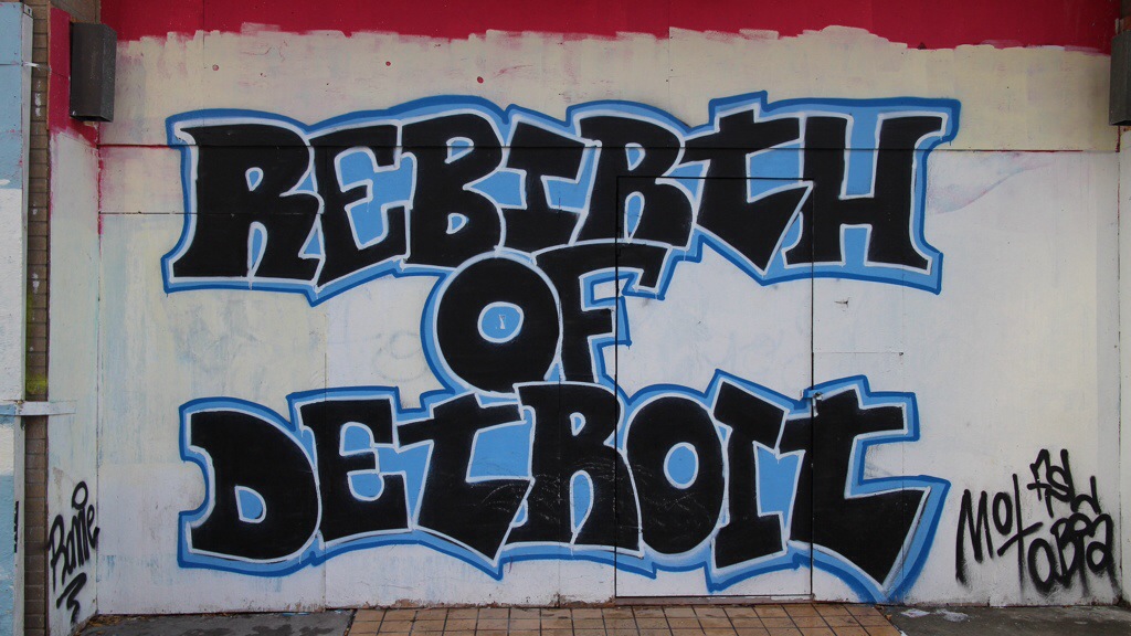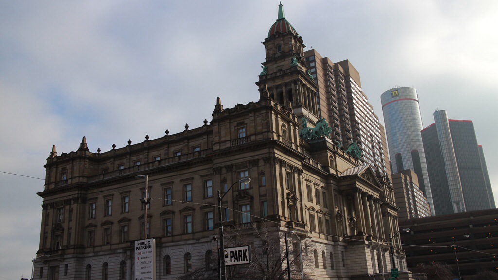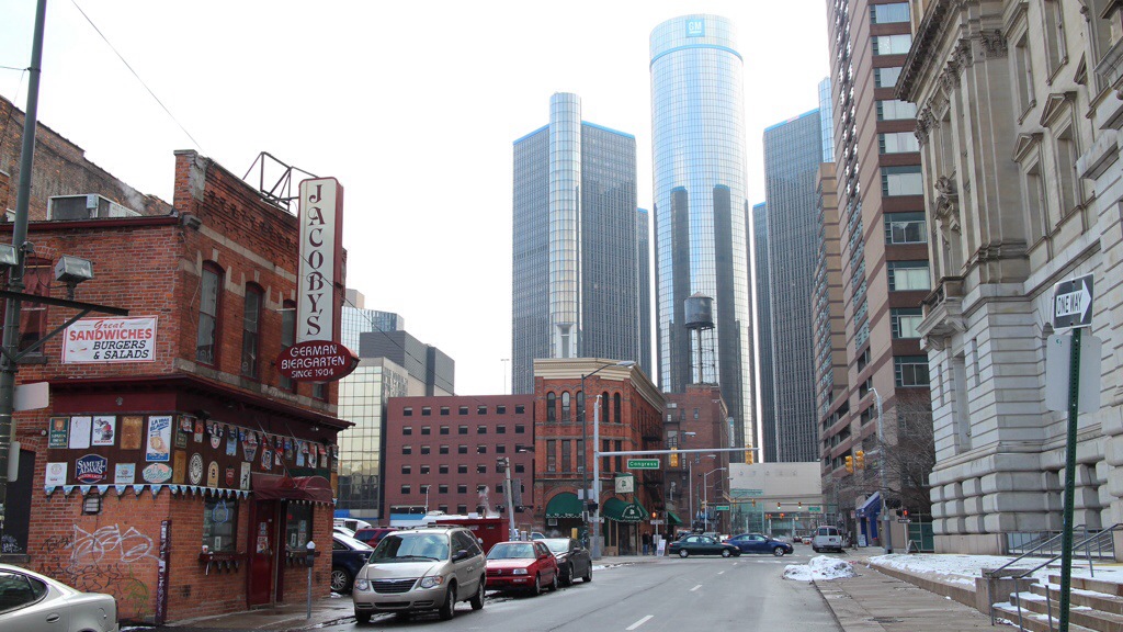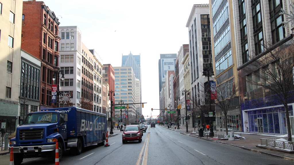 Die Woodward Avenue, die Prachtstraße der 20er Jahre, mit 100.000 von Leuten auf der Straße, heute eine Begegnungszone, ohne Regelung, der Verehr hat sich selbst beruhigt.