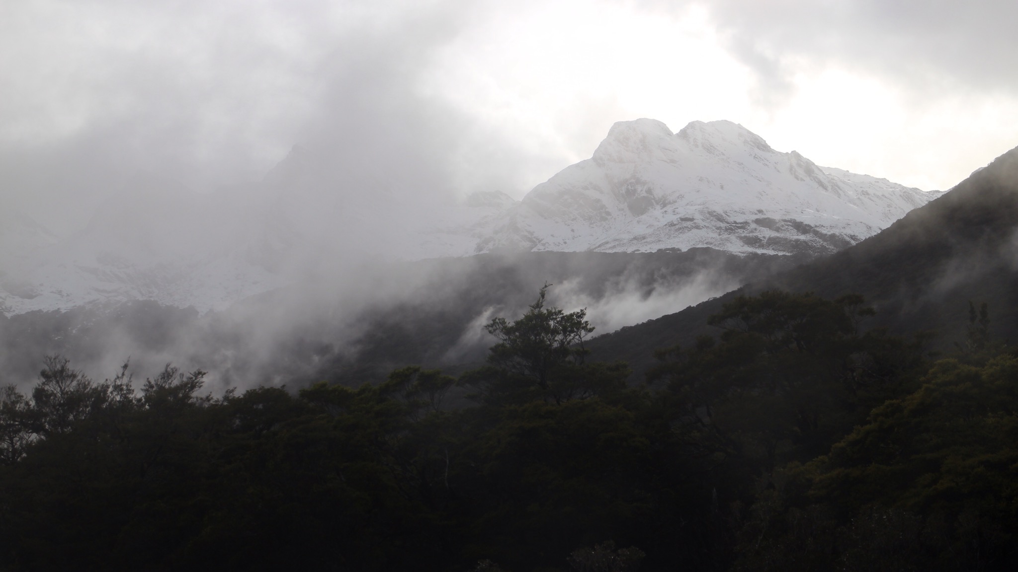 Die obersten Gipfel schon angestrahlt von der schüchternen Morgensonne, die gegen die Wolken ankämpft…