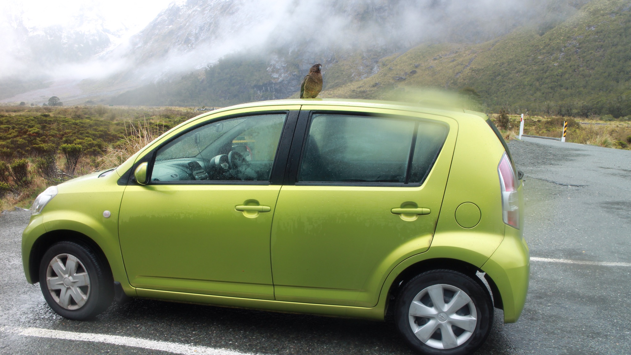 Möchte sich vorstellen, der Herr Kea, seines Zeichen ein alpinistischer Papagei, quasi mit Anorak und Haube geboren, und teilen sich die Parkplätze auf, sprich immer nur einer ist immer für den jeweiligen zuständig, könnt ja Futter abfallen…