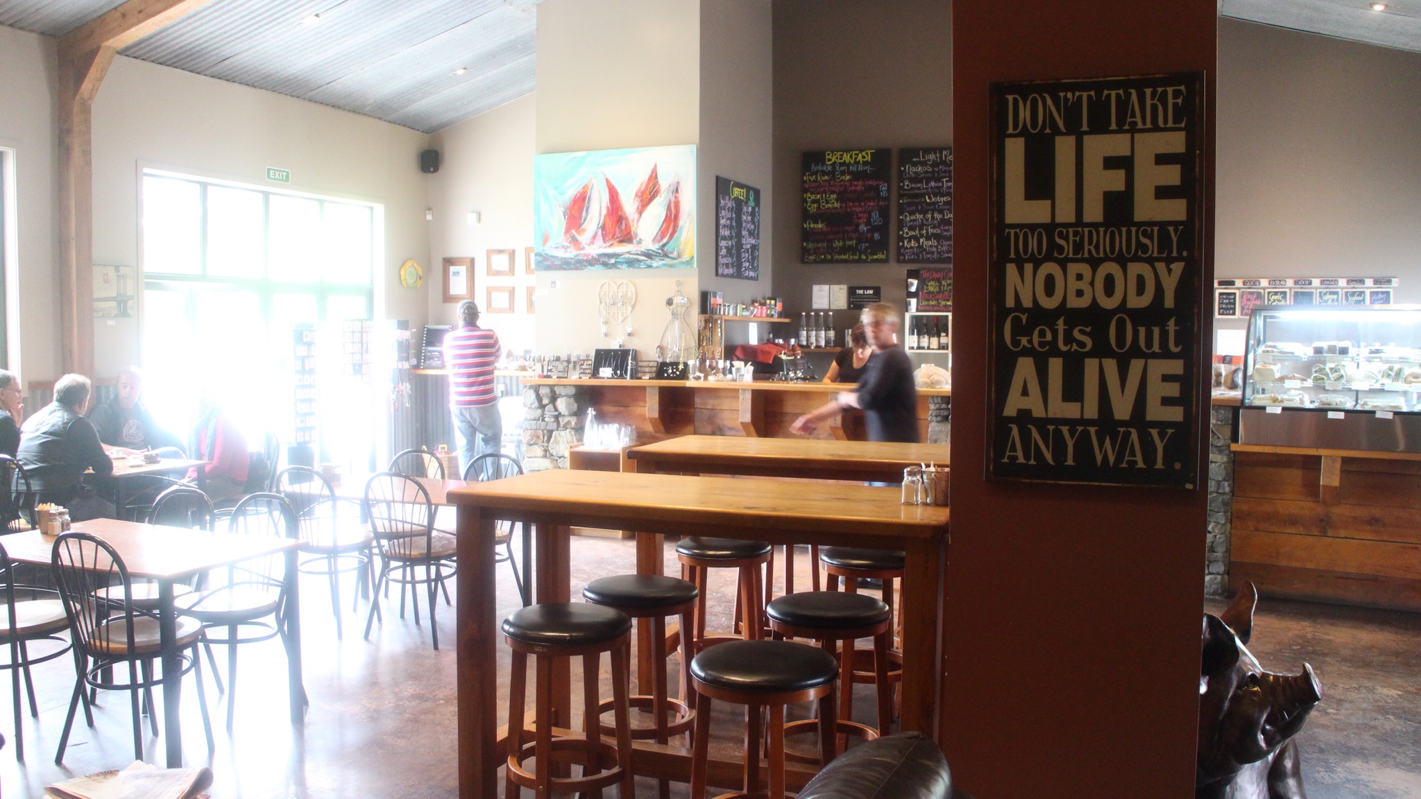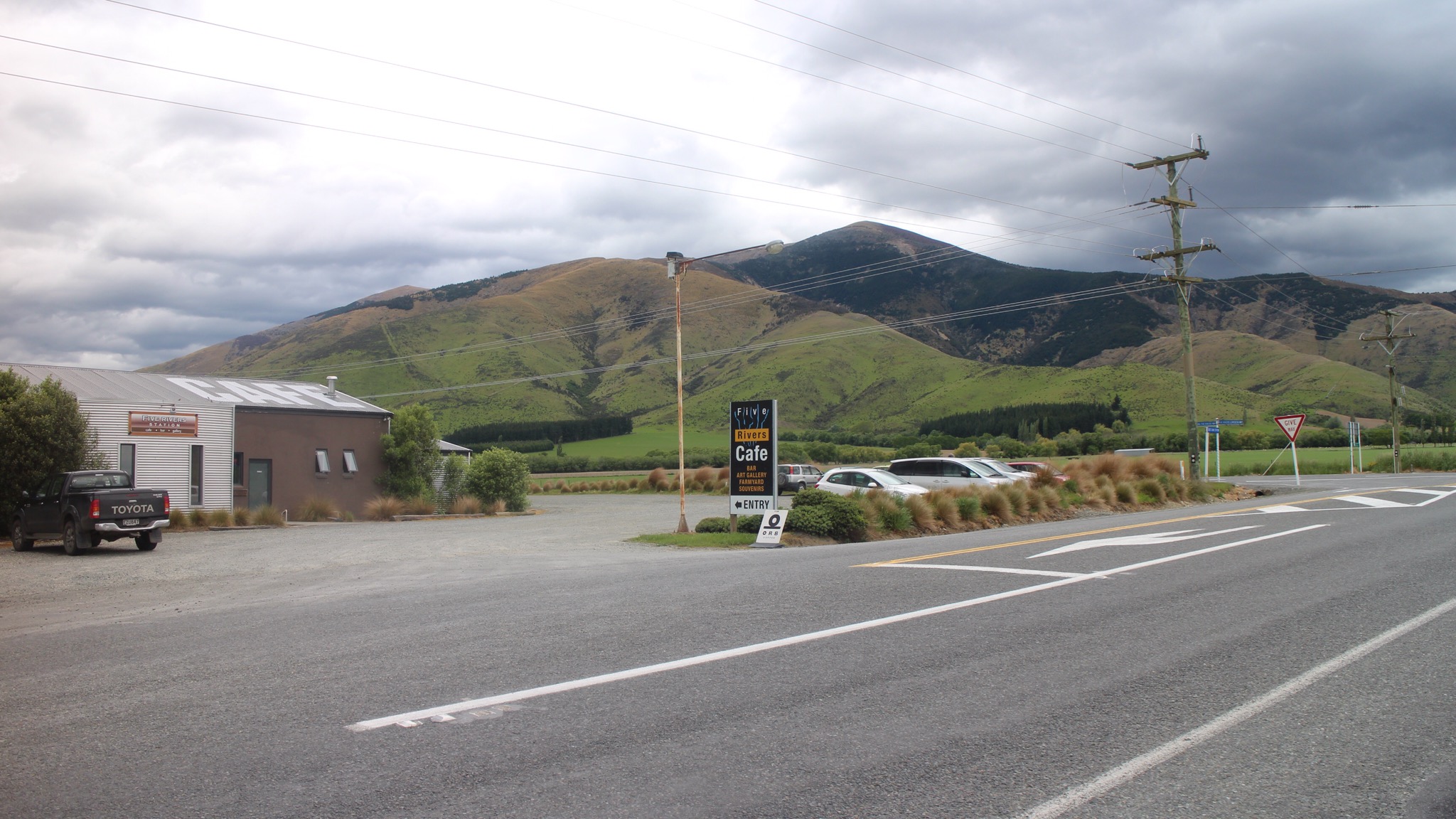 Kaffeepause dann in 5 Rivers. Ein Straßendorf mit eigener Kreuzung, und wie es sich für Neuseeland gehört, ein anständiges Café.