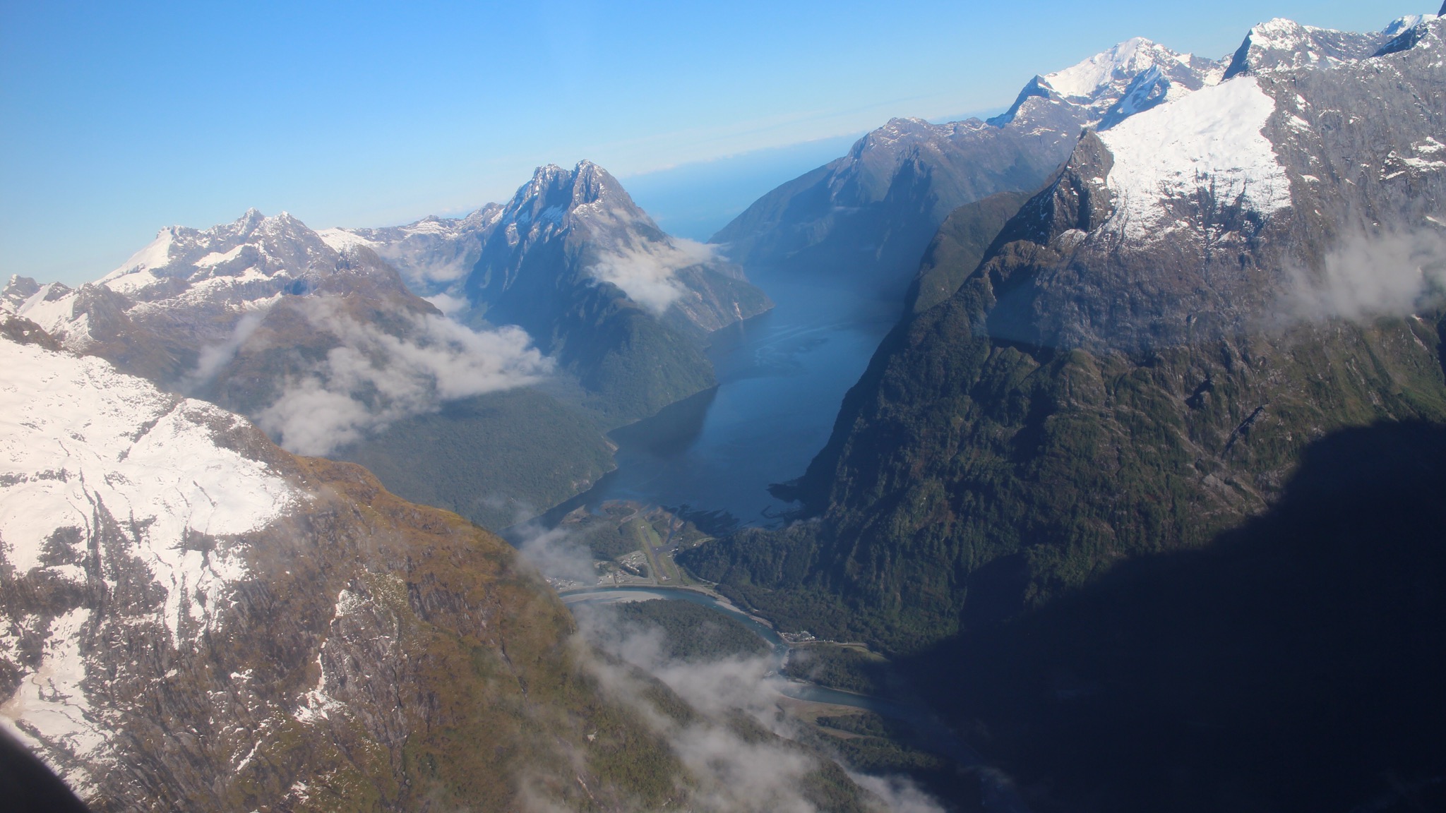 Unter uns taucht schon der Flughafen auf und das hauptsächliche Ziel: der Milford Sound.