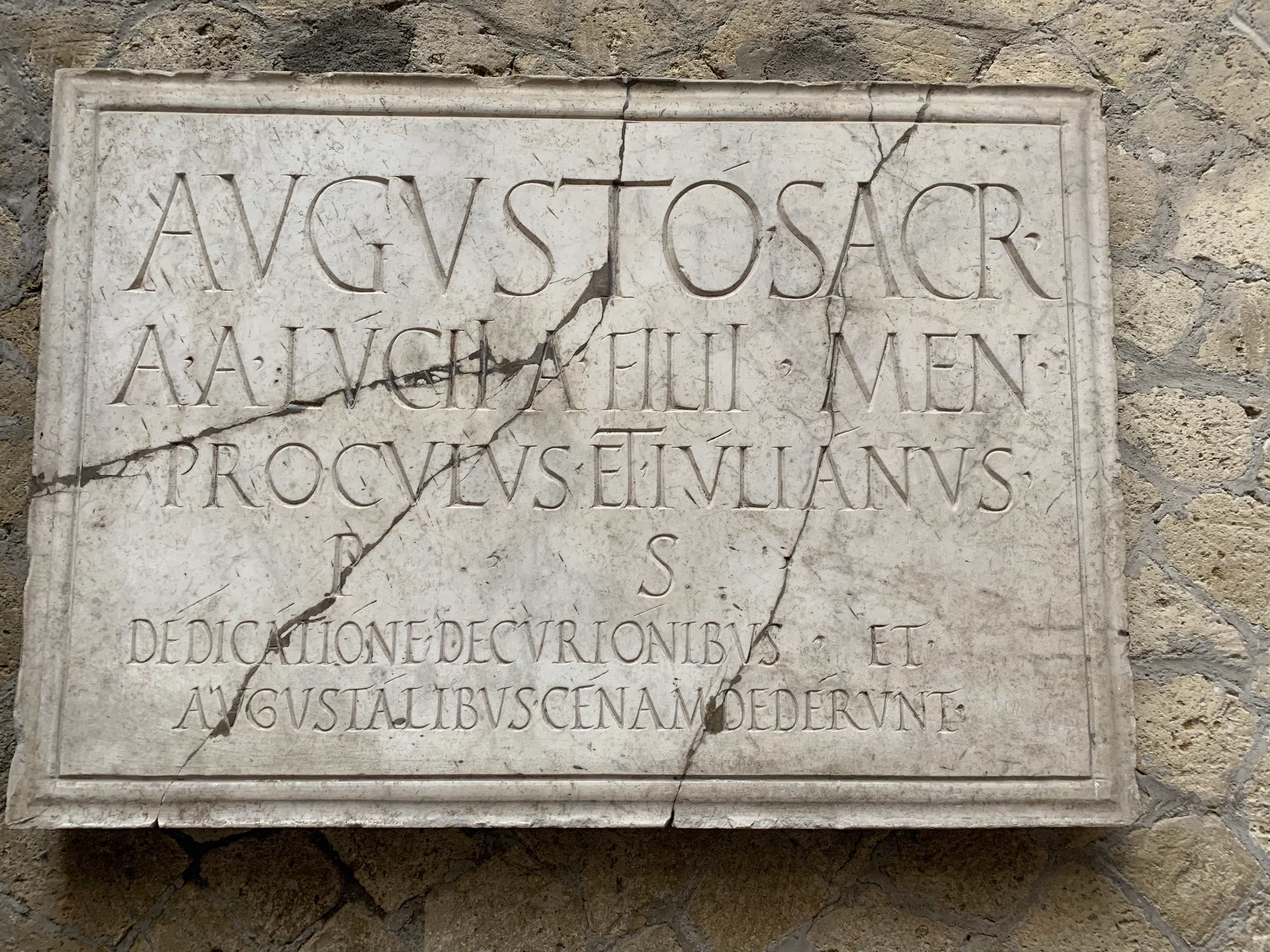 Oder die Versammlungshalle der ehemaligen Sklaven, die Augustus und Julius Caesar als Götter verehrt haben, die spinnen die Exsklaven. Die gestiftete Marmortafel hat aber paar Sprünge abbekommen